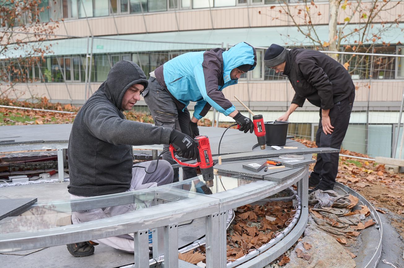 Prostor bude také funkční. „Bude tady například wifi či možnost nabít si mobilní telefon, studenti si tady mohou sednout, lehnout na lavičku, pracovat tady,“ uvedl Krejčí. „Chtěli jsme to udělat tak, aby zde člověk mohl trávit volný čas,“ dodal. Práce jsou v plném proudu. Ocelová konstrukce je již hotová, nyní se nalepují jednotlivé desky.