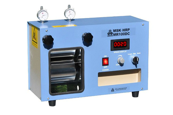 Elektrický válcovací lis s převodovým motorem s proměnlivou rychlostí 24VDC a spínaným napájecím zdrojem s certifikací UL, který lze použít pod plynovou rukavicovou skříní Argon od 110V do 220V AC. Má dvojité válce o průměru 100 mm. x 100 mm šířka a je ideálním válcovacím lisem pro přípravu elektrodové fólie pro výzkum Li-Ion baterií po potažení a sušení.).