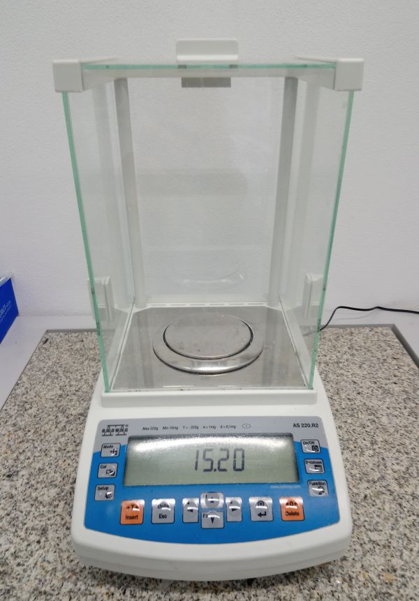 Analytické laboratorní váhy se zařízením uzpůsobeným ke stanovení hustoty látek pomocí metody dvojího měření. Jedná se o měření hmotnosti látky ve vzduchu a následně v kapalině o známé hustotě (nejčastěji voda).