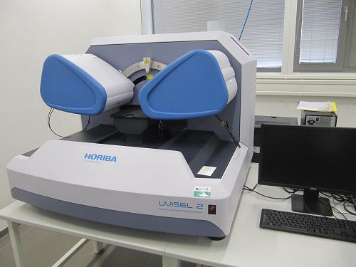Spektroskopický elipsometr UVISEL 2 (Horiba) s fázově modulovaným designem (PEM – fotoelastický modulátor, 50 kHz) s automatickým goniometrem (35-90°v krocích 0.01° - umožňuje Variable Angle Spectroscopic Ellipsometry) a rozsahem vlnových délek od 180 nm do 2200 nm se spektrálním rozlišením lepším než 0.5 nm a automatickým nastavením šířky štěrbiny. Zdroj – Xe lampa 150 W. Achromatická optika, zobrazovací systém. Automatické seřízení horizontálního náklonu vzorku pro měření, motorizované nastavením v ose Z, v rozsahu alespoň 40 mm, autofokus v ose Z. XY motorizovaný mapovací stolek s rozsahem posunu 200 mm v obou směrech X a Y. Automatický výběr velikostí achromatických měřících bodů pro přesné polohování měřícího bodu, dostupné pro všechny úhly dopadu. Průměr měřícího bodu ≤ 40um pro 90°. Doba měření spektra je < 5 minut pro rozsah přístroje s krokem: 0.05 eV. Lze měřit tloušťku transparentních vrstev až do 40µm. SW Delta Psi V2.